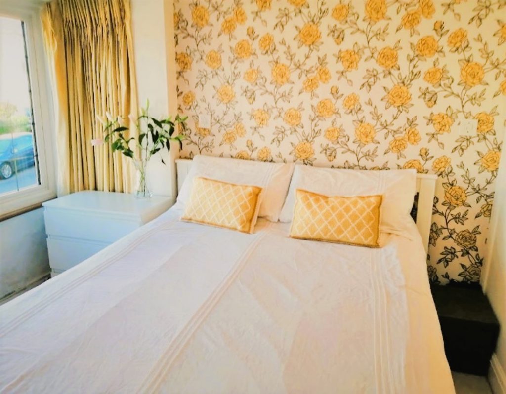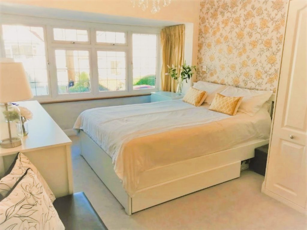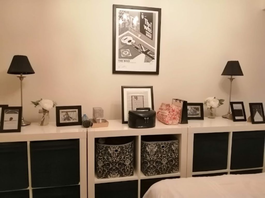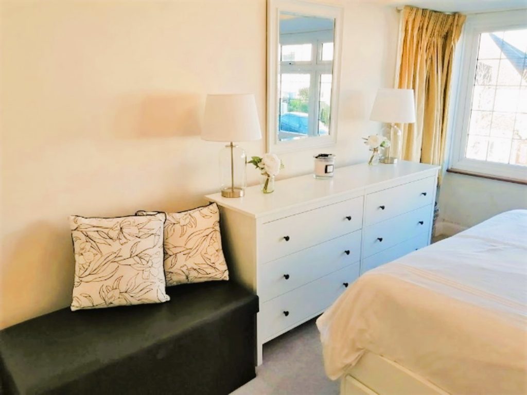 All clutter was removed, a bouquet of flowers was added to chest of drawers.  The bed was dressed with new white covers and cushions which co-ordinate with the curtains and wall paper.  The cube storage was replaced with a double chest of drawers, accessorised with lamps and a large mirror.  The ottoman was dressed as a seating area using cushions.