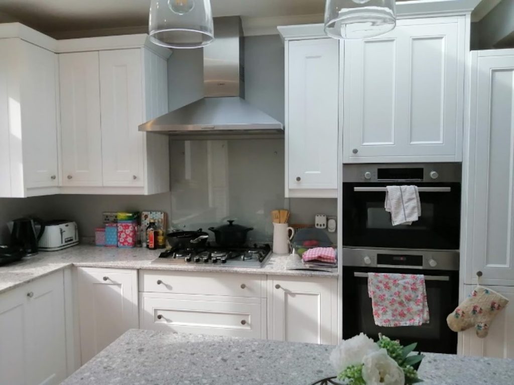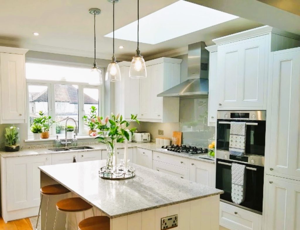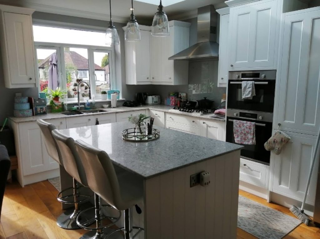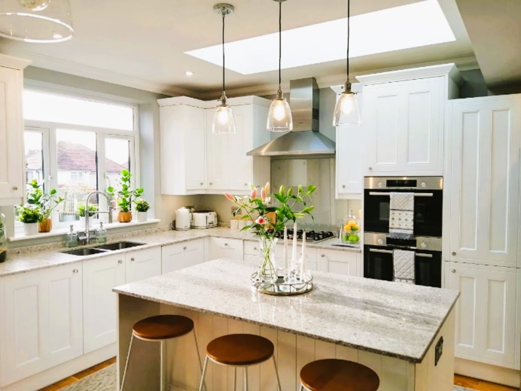 Counters were cleared of clutter and  plants, glass and neutral accessories, cannisters and textiles were added. The island was accessorised with candles and a bouquet of flowers and the bulky bar stools were replaced with lightweight oak seated stools.