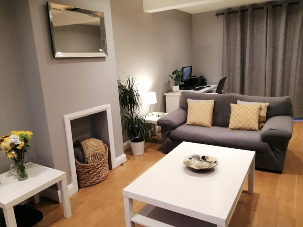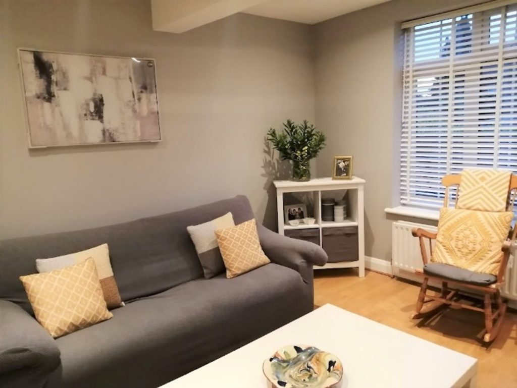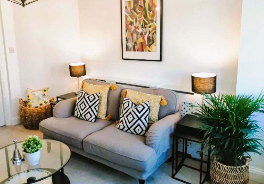 The sofas were covered with grey stretch ribbed covers and new curtains were hung.  Plants and ochre cushions and accessories were used to add warmth.