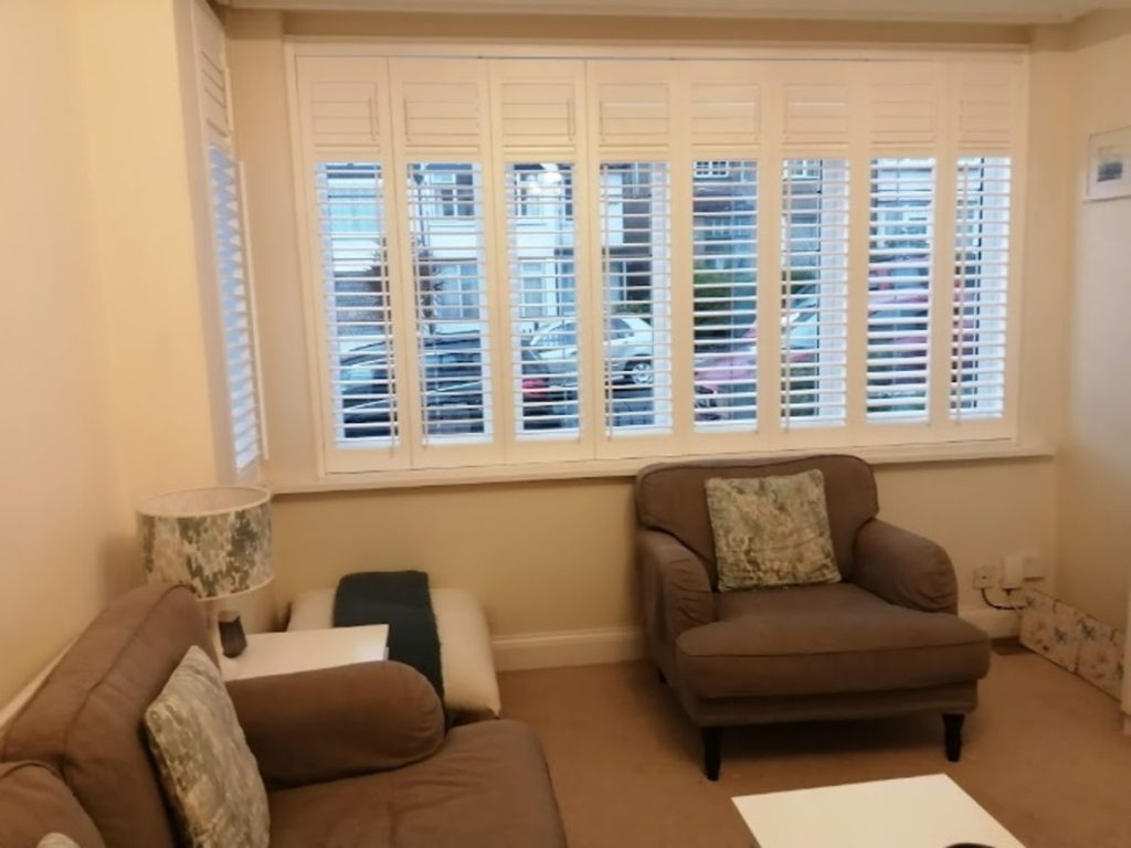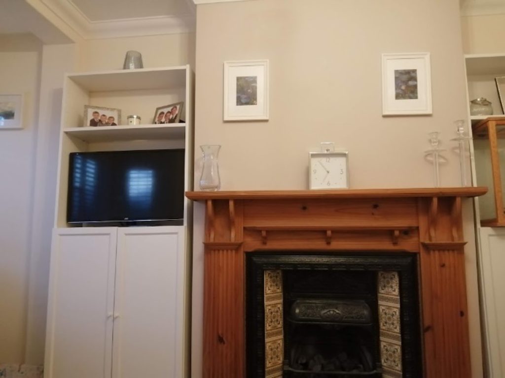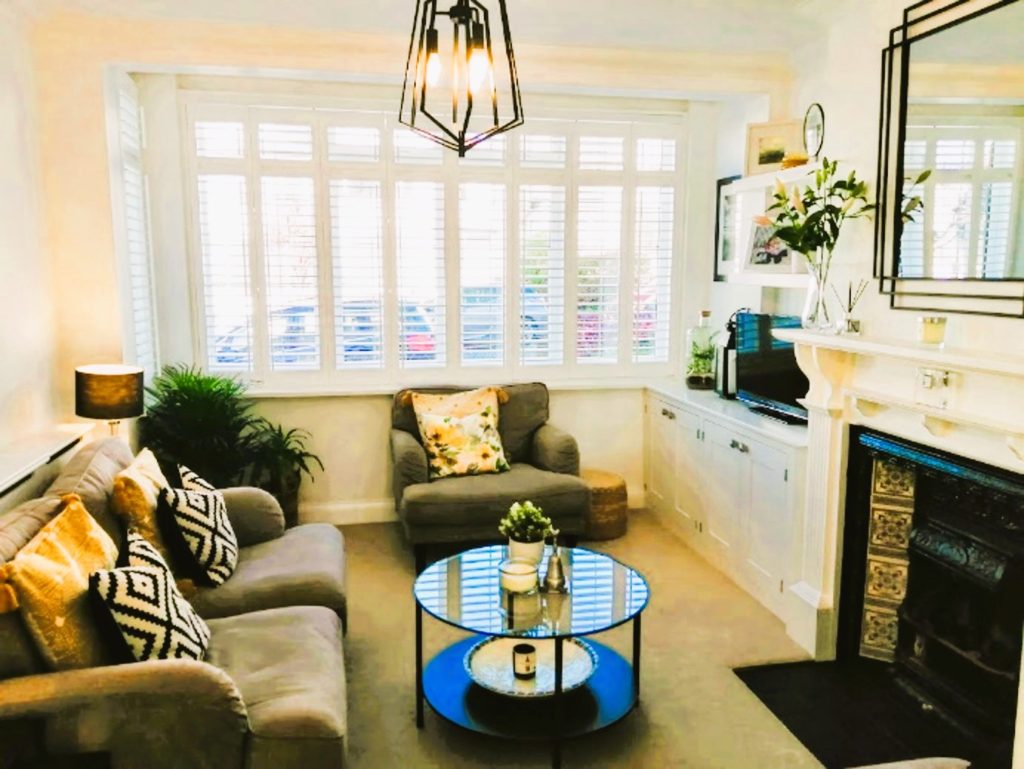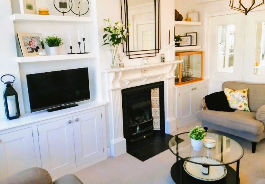 The room was painted white and black furniture, accessories and light fittings were installed which created more contrast in the room.  Greenery  and ochre and woven accessories were added for warmth.  Bespoke built in cupboards and shelves were installed and painted white as was the existing fireplace