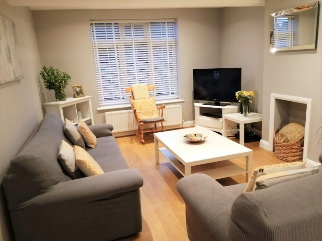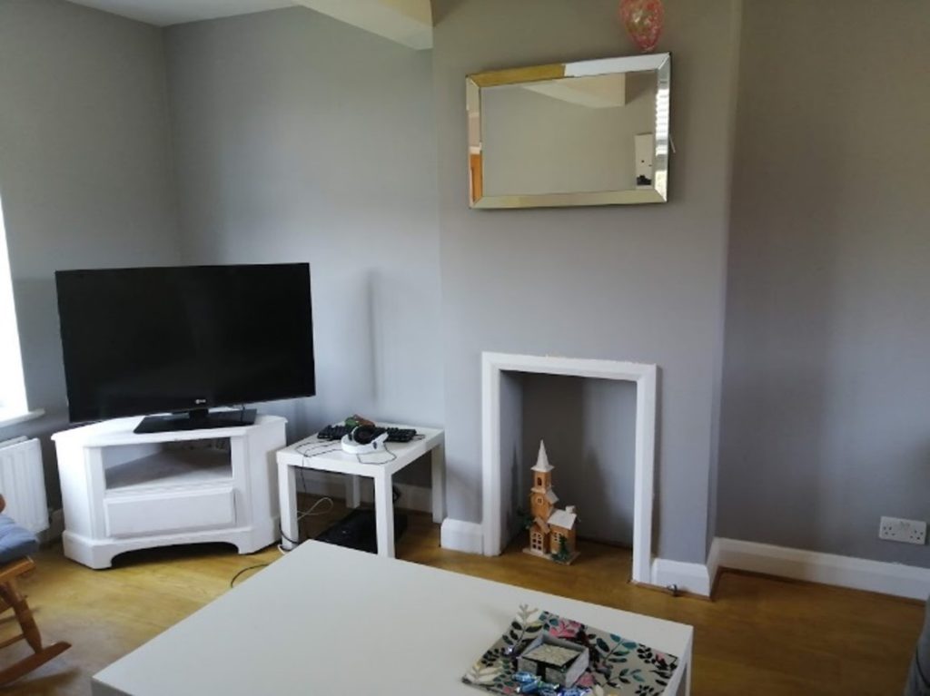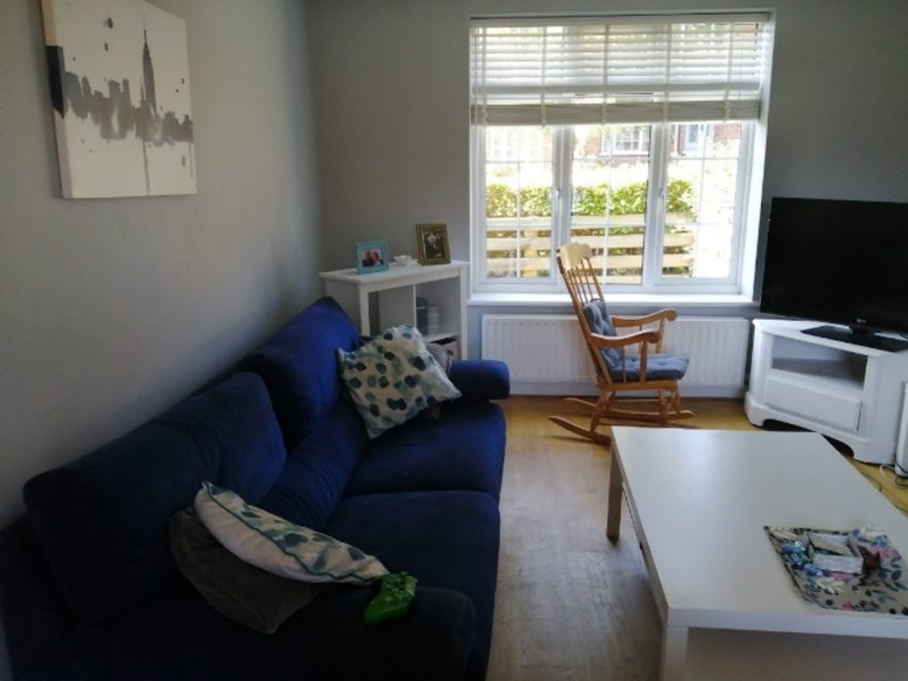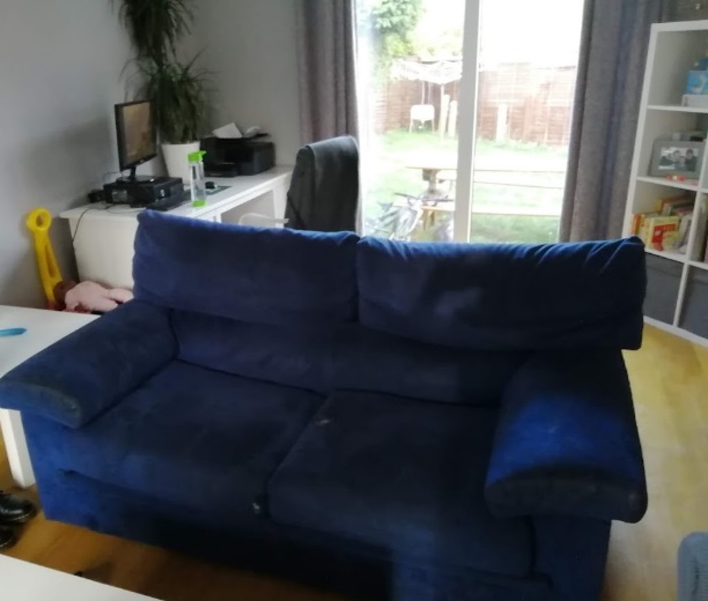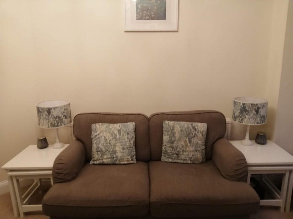 The living room was cold and uninviting. The sofas were very marked and worn and the curtains had shrunk.