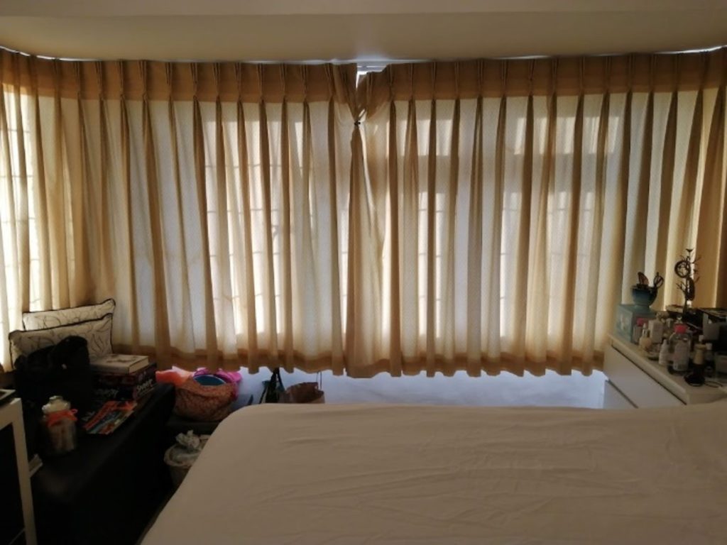 The bedroom curtains were very worn and there was a lot of clutter on the floor and on surfaces.  The cube storage was old and makeshift looking and not suited to a master bedroom.